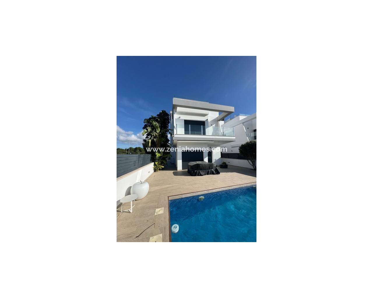 Una villa de lujo con hermosas vistas a los campos de naranjos y al mar. Esta moderna villa es muy espaciosa y tiene tres dormitorios con tres baños, una gran piscina privada y es muy privada. La propiedad está ubicada en el campo de Golf Lo Romero y tiene vistas de 360 grados al mar, golf, montaña y las distintas huertas. La villa tiene aire acondicionado con zona de aire, calefacción por suelo radiante en los baños y persianas eléctricas. Con techos altos y orientación sur, esta es una villa muy luminosa y aireada y es perfecta para cualquiera que busque vistas, paz y tranquilidad.