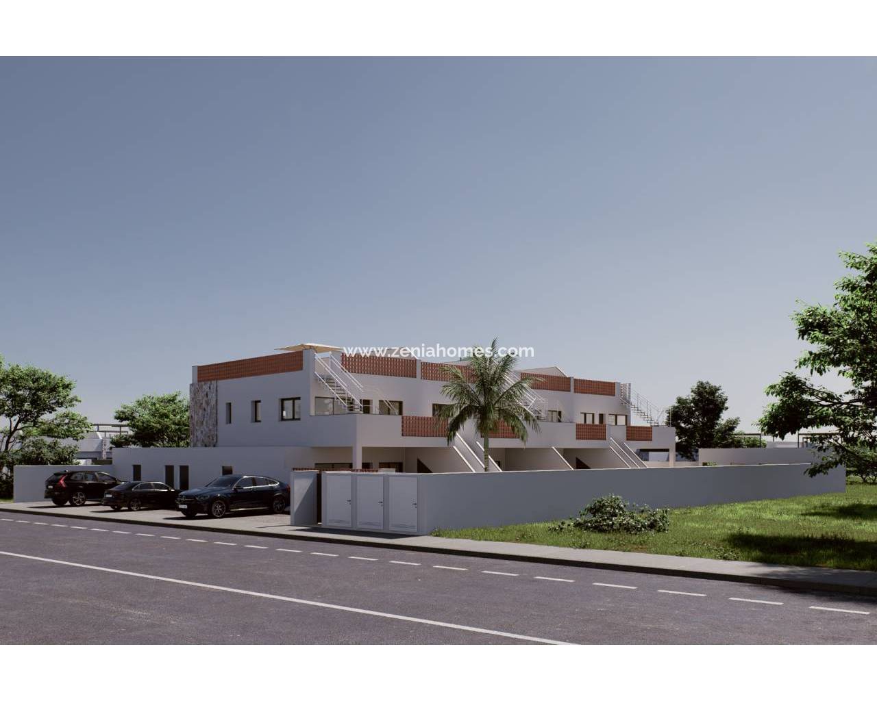 Dette nye, moderne og elegante boligkomplekset ligger i den sjarmerende kystbyen Pilar de la Horadada. Nyt nærheten til havet, alle fasiliteter, restauranter og den autentiske spanske livsstilen i hjem som kombinerer komfort, stil og en ekte middelhavsatmosfære. Komplekset består av leiligheter i bungalowstil, tilgjengelig i to attraktive alternativer: første etasje, med en romslig terrasse foran og en ekstra terrasse bak, perfekt for å nyte skygge og en forfriskende bris på solfylte dager; og toppleiligheten, med en privat balkong og et stort solarium hvor du kan nyte solen hele dagen lang.