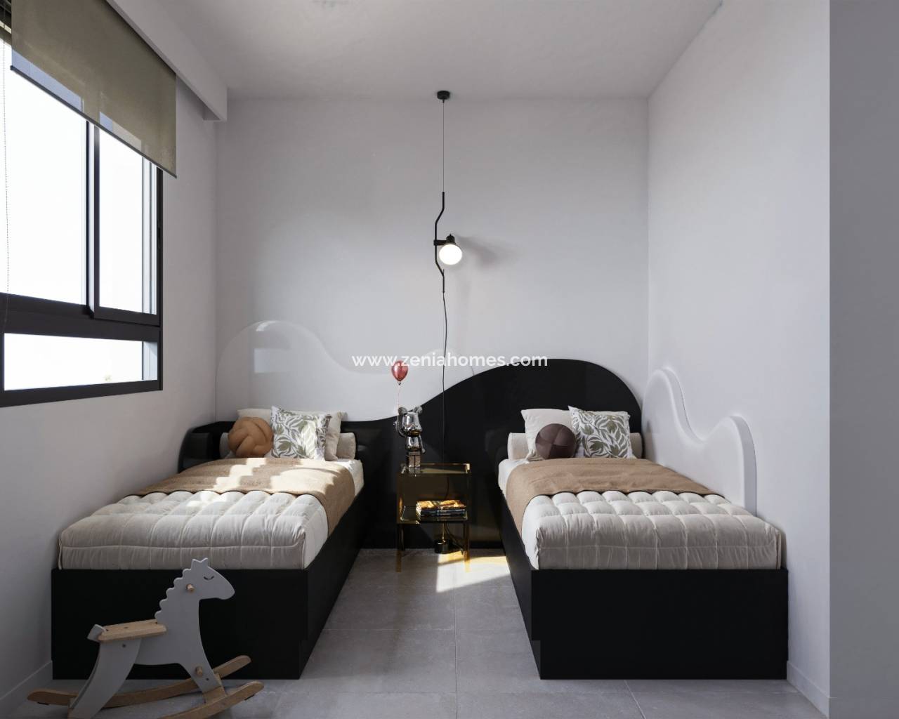 You can choose between 2- or 3-bedroom bungalows, designed with a high level of comfort and quality. The homes are delivered with smooth, painted walls. The floors and adjacent terraces are tiled with high-quality tiles and matching skirting boards. The kitchen is fully equipped with upper and lower cabinets, a sink, an induction hob, and an extractor hood. Additionally, all bedrooms have custom-made built-in wardrobes and blinds.