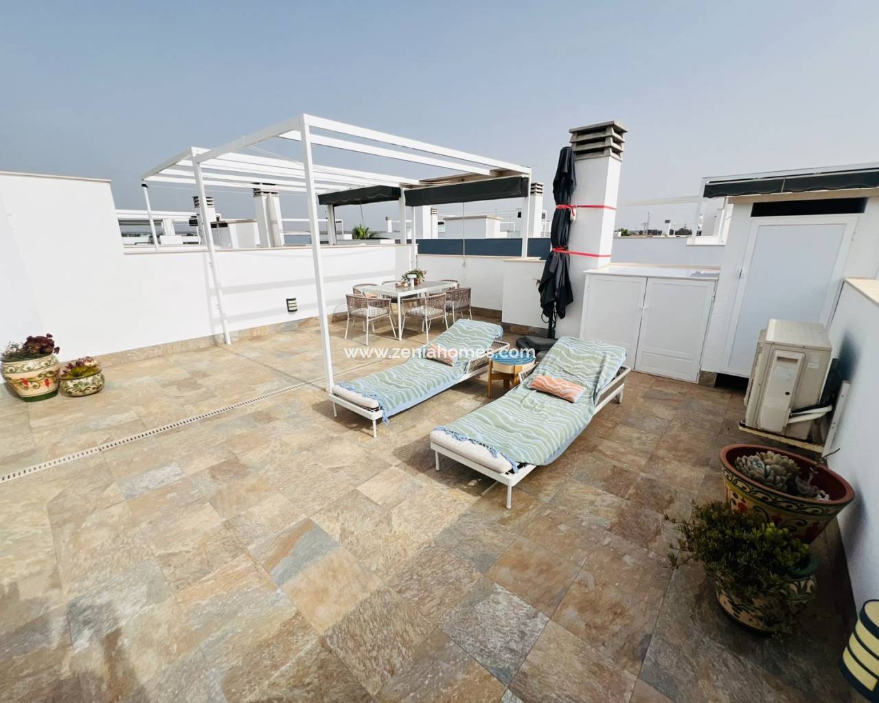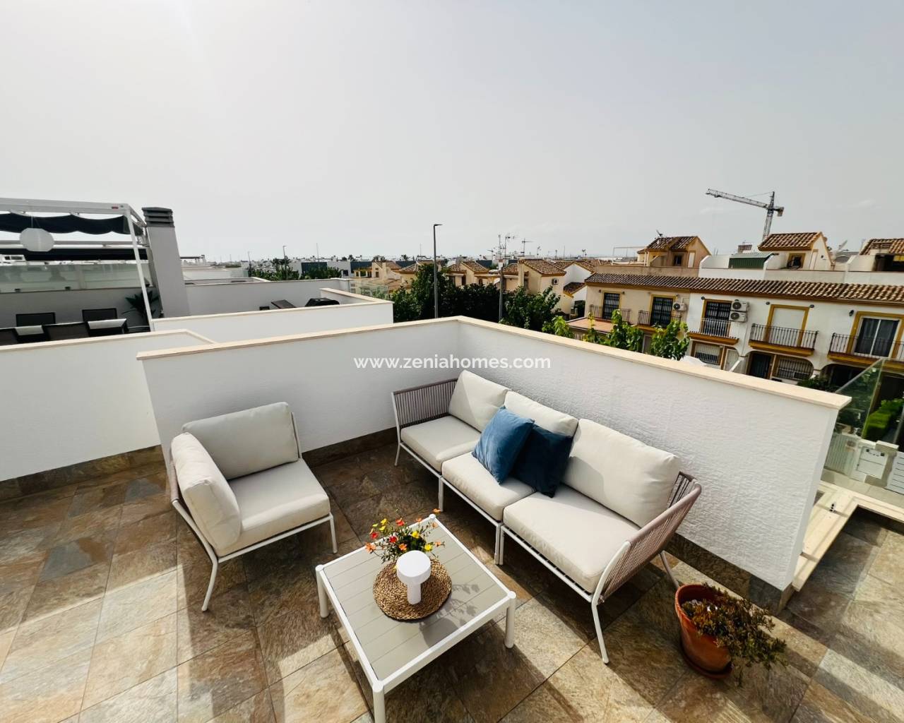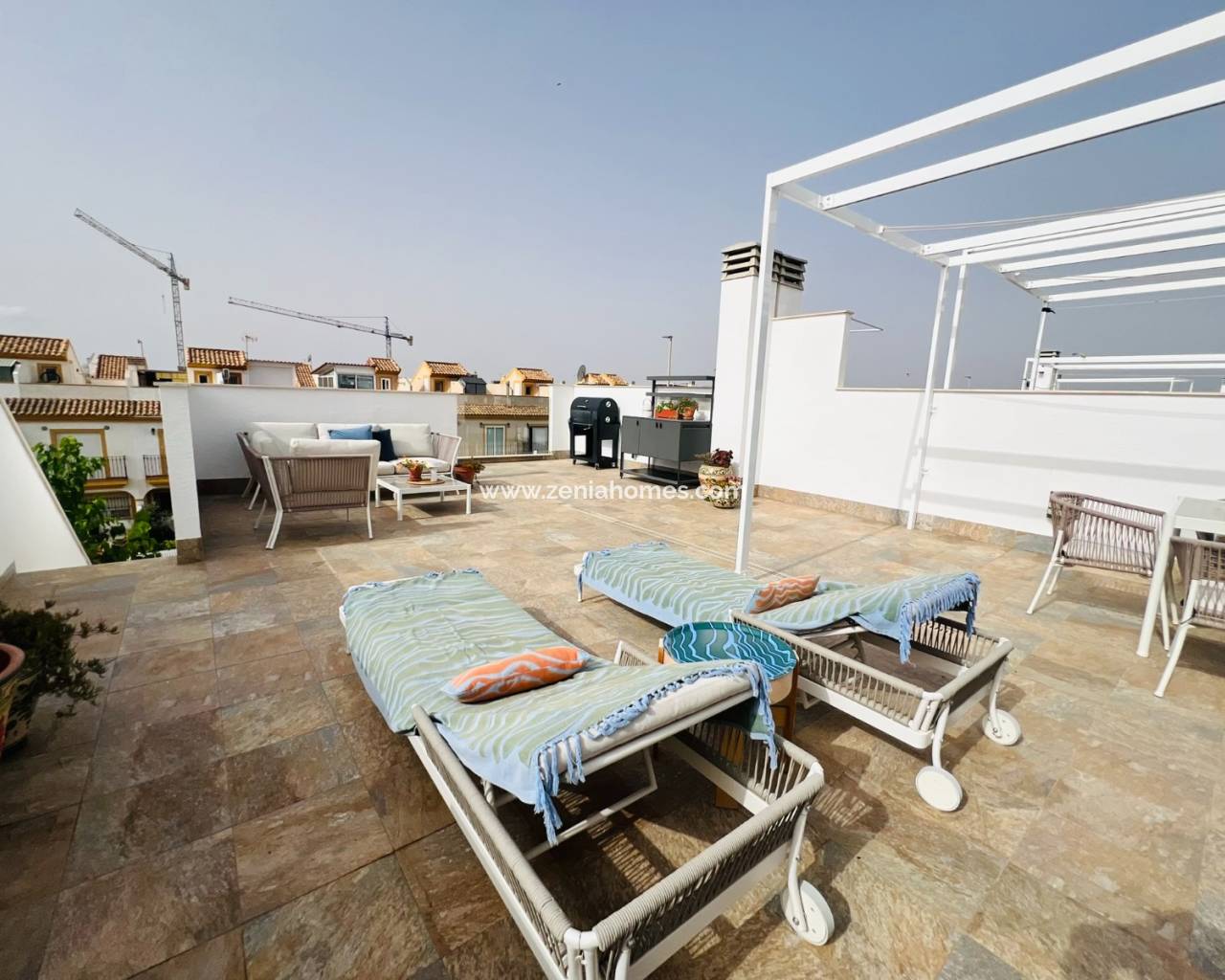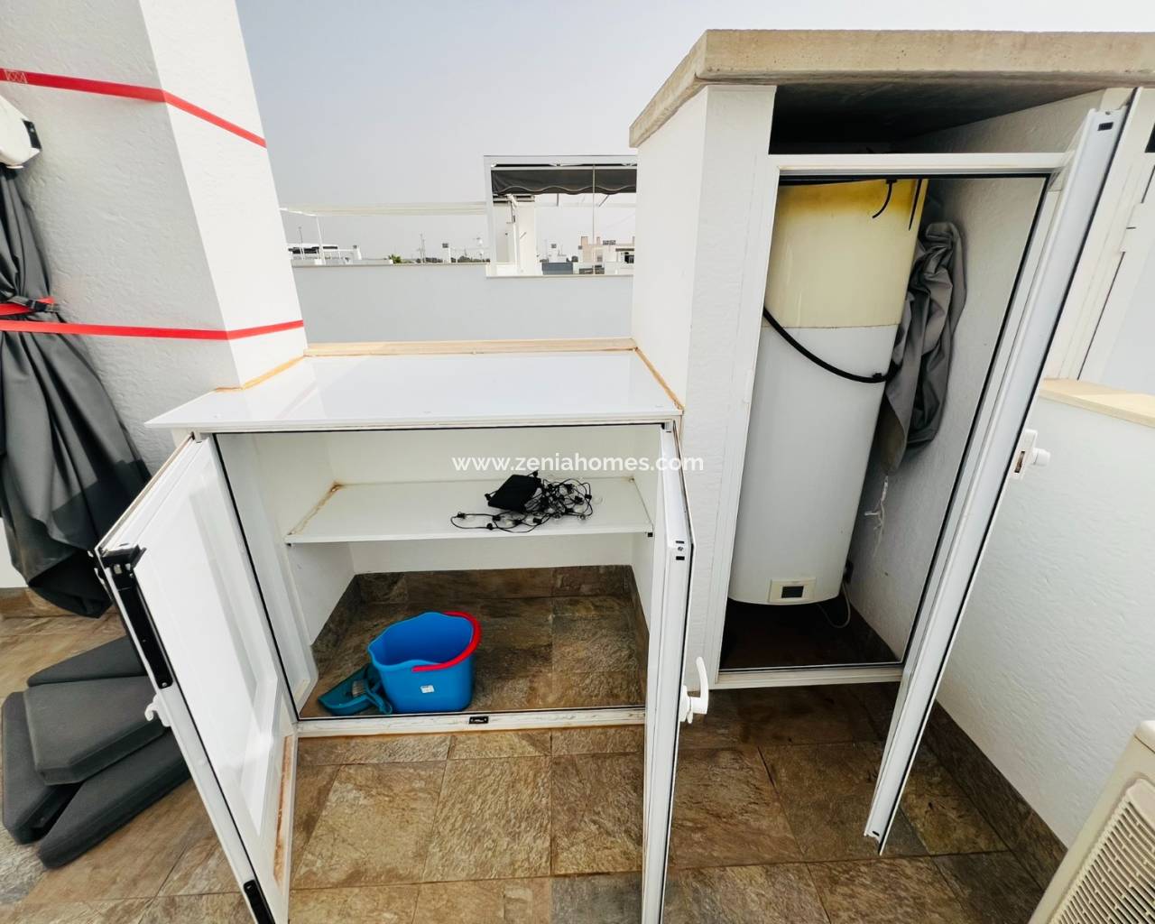 A beautifully looked after penthouse property with a large sun terrace. This property is South facing and has sea views, the property has 2 bedrooms and 2 bathrooms, one which is en-suite. The complex has 2 large communal swimming pools and a children's play park. The property comes fully furnished and has an off street parking space and a store room. The large balcony leads to an even larger sun terrace which has a pergola for shade and another storage room. The property is located close to the sports center and the rambla which you can walk or cycle down to the long sandy beach.