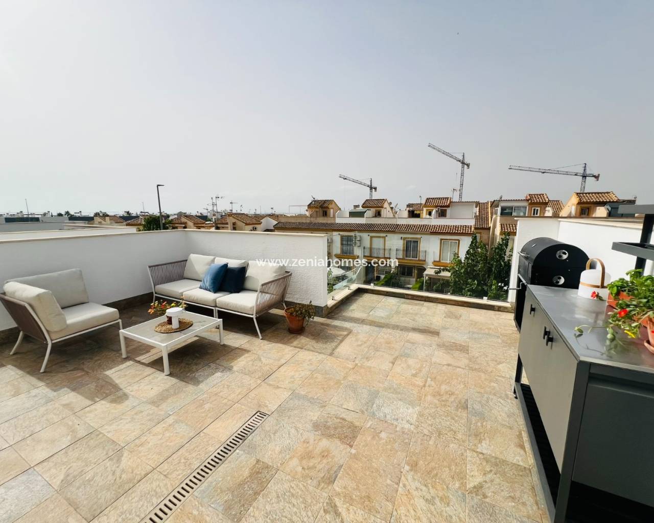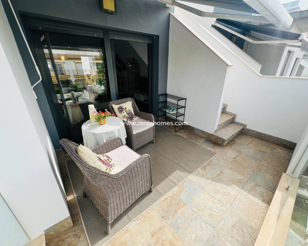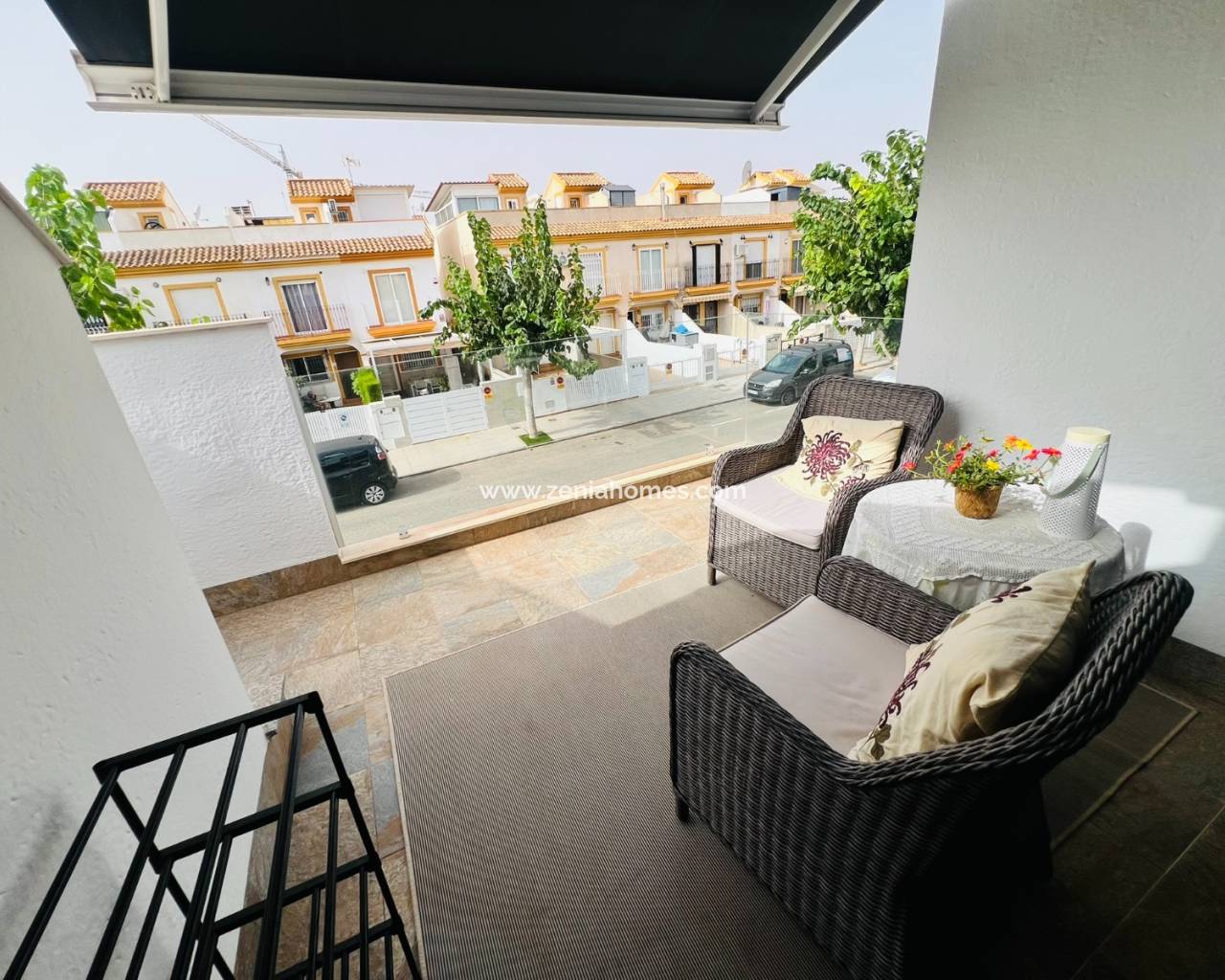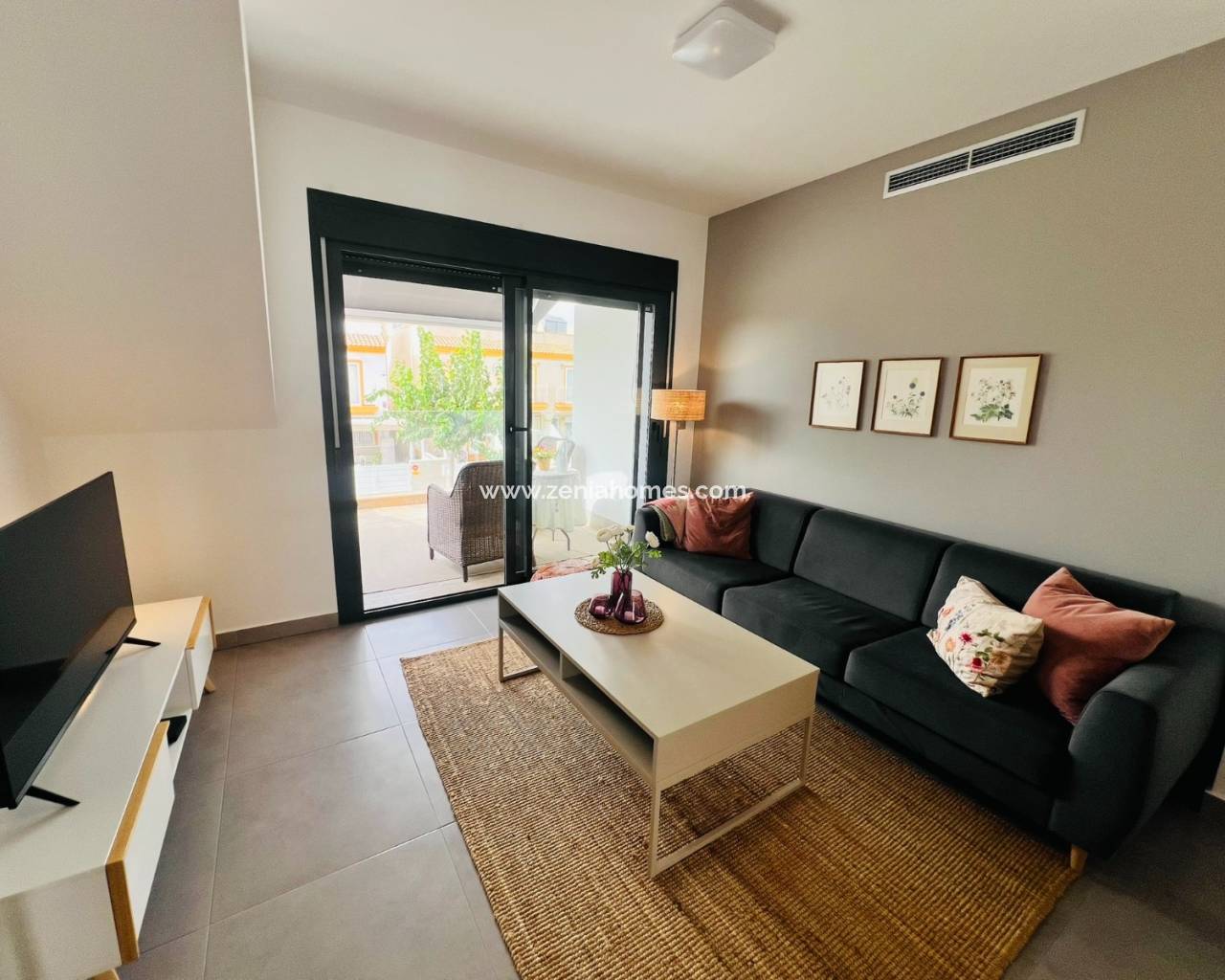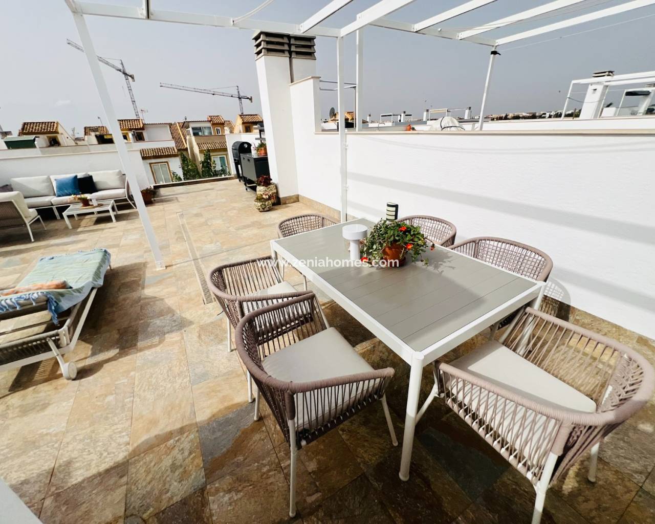 A beautifully looked after penthouse property with a large sun terrace. This property is South facing and has sea views, the property has 2 bedrooms and 2 bathrooms, one which is en-suite. The complex has 2 large communal swimming pools and a children's play park. The property comes fully furnished and has an off street parking space and a store room. The large balcony leads to an even larger sun terrace which has a pergola for shade and another storage room. The property is located close to the sports center and the rambla which you can walk or cycle down to the long sandy beach.