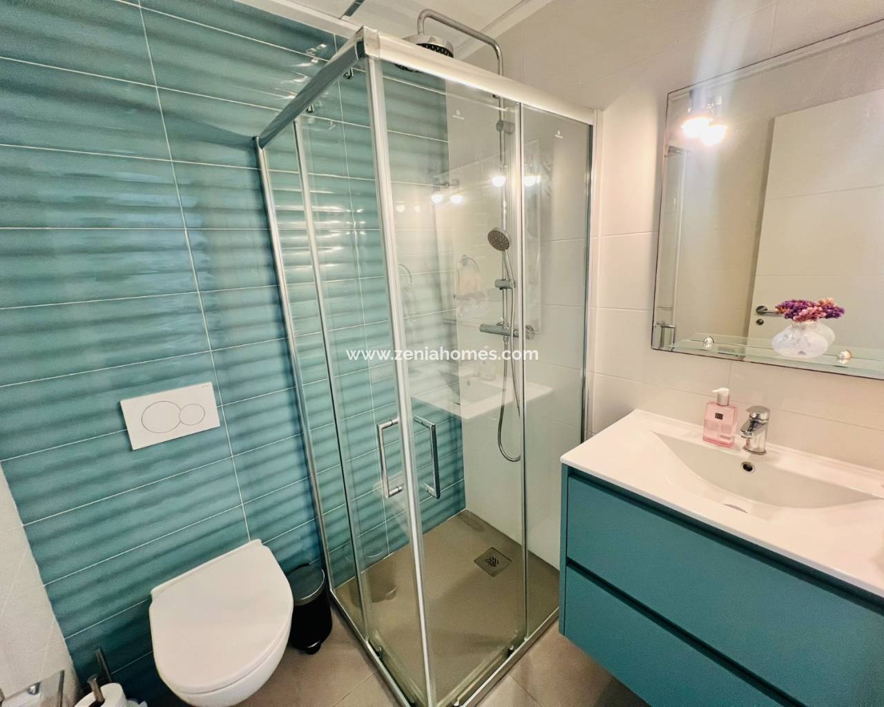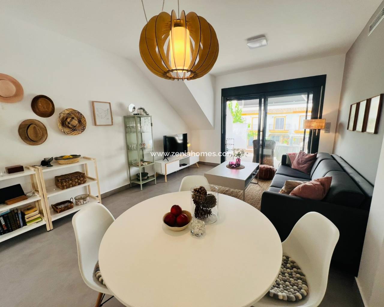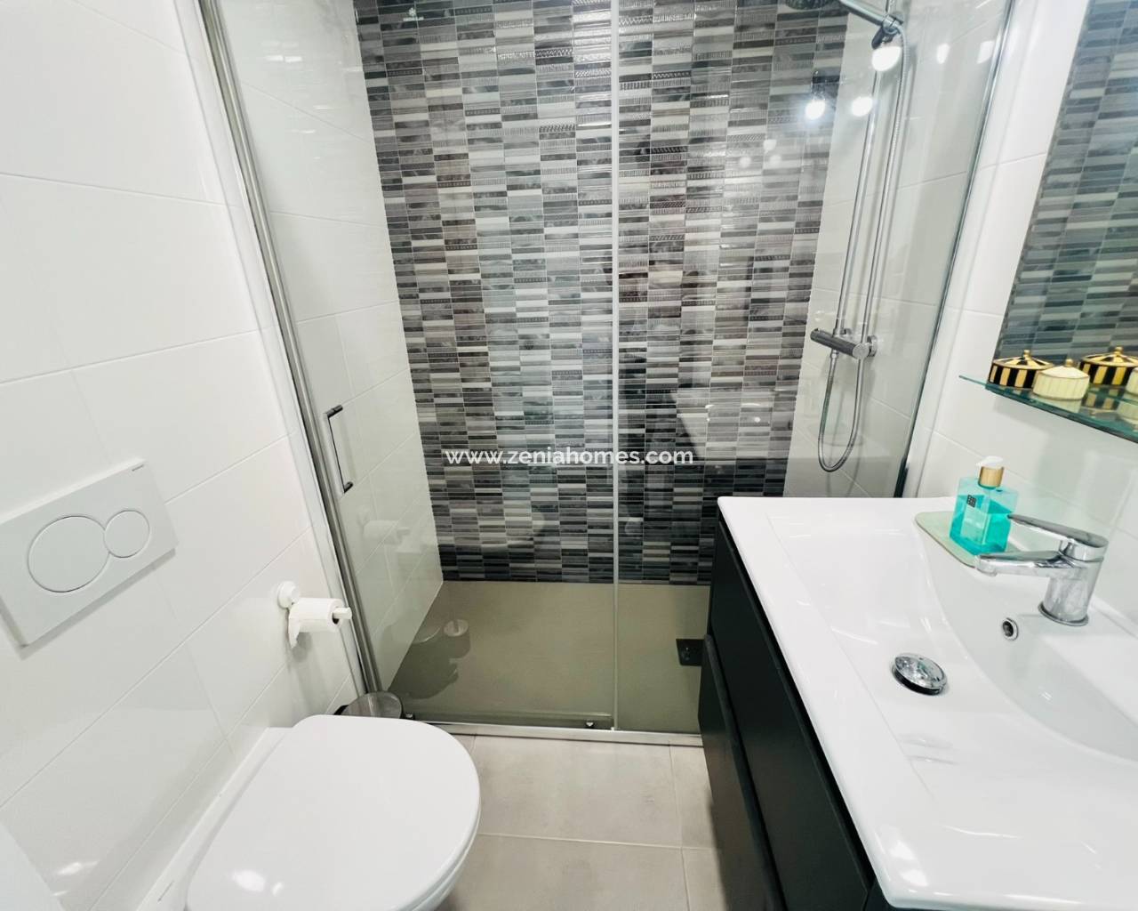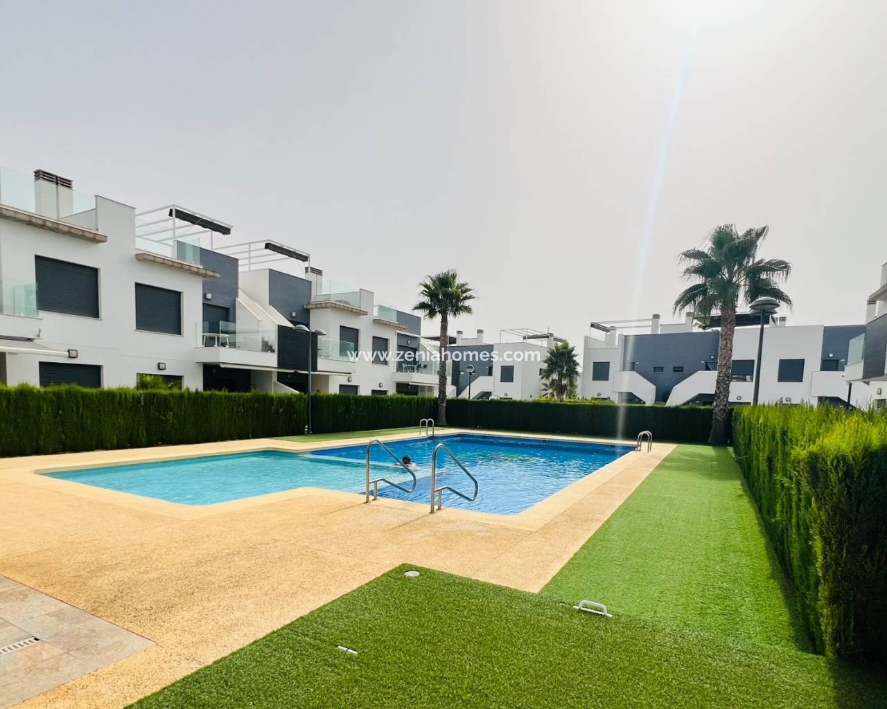 A beautifully looked after penthouse property with a large sun terrace. This property is South facing and has sea views, the property has 2 bedrooms and 2 bathrooms, one which is en-suite. The complex has 2 large communal swimming pools and a children's play park. The property comes fully furnished and has an off street parking space and a store room. The large balcony leads to an even larger sun terrace which has a pergola for shade and another storage room. The property is located close to the sports center and the rambla which you can walk or cycle down to the long sandy beach.