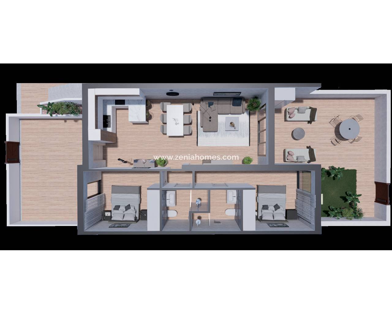 Its Premium facilities and green areas will allow you to enjoy with your family and friends the 320 days of sunshine that the Costa Blanca offers. The houses have more than 131m2 distributed in a spacious living-dining room with an open-plan kitchen, 2 large bedrooms and 2 full bathrooms. You can choose between ground floor bungalows with their 2 large private terraces to enjoy the climate of the Costa Blanca. Or first floor bungalows of 178m2 with its 85m2 solarium with panoramic views of the Laguna Rosa and the Mediterranean Sea.