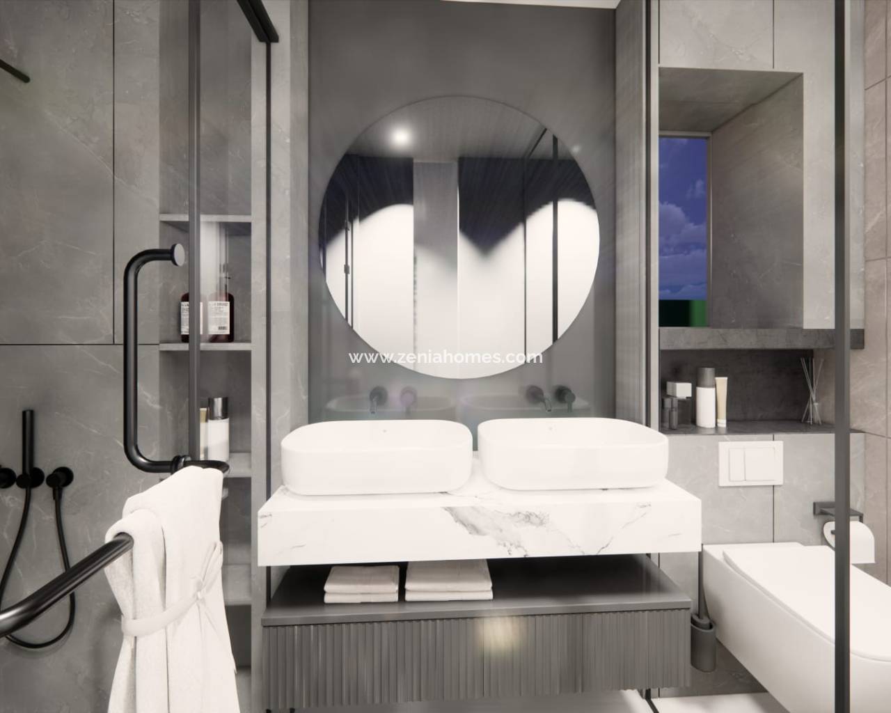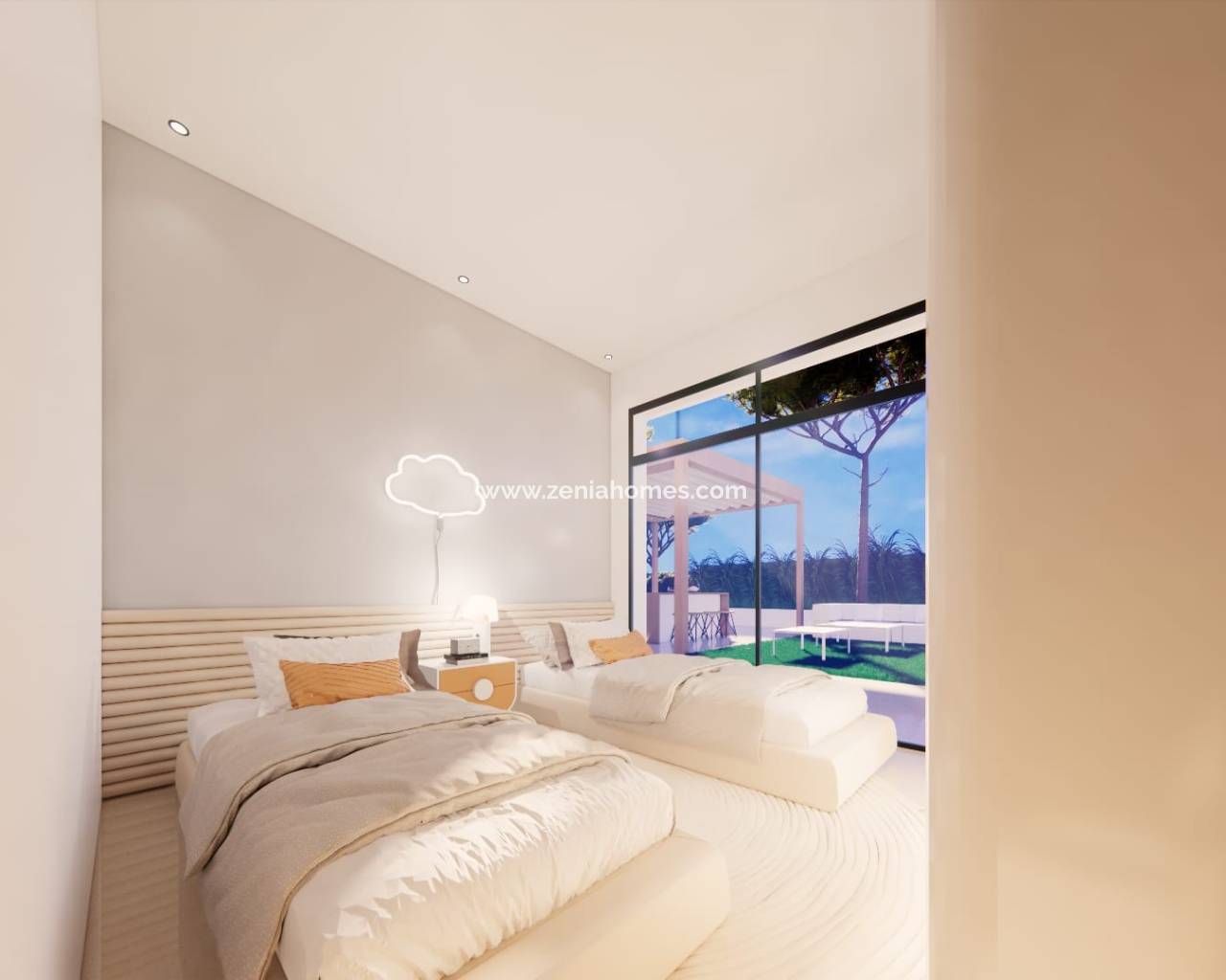 A beautifully designed new villa which is located in Pinar de Campoverde close to the pine forest and nature walks. Pinar de Campoverde has aproximately 3.000 buildings, with mainly english,german,dutch and spanish residents. Each villa is set on a 800m2 plot with a private pool, private garage and a large terrace.  These family villas are distributed over one floor with a large open-plan living/dining room with kitchen, two double bedrooms, a family bathroom, guest toilet, utility room and a master bedroom with en-suite bathroom and dressing room.