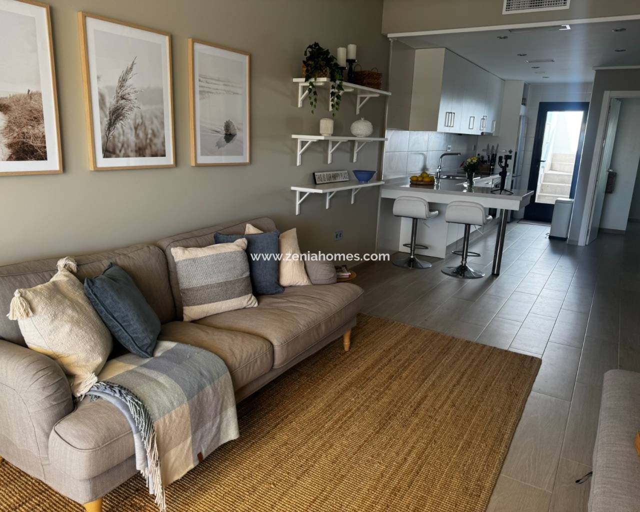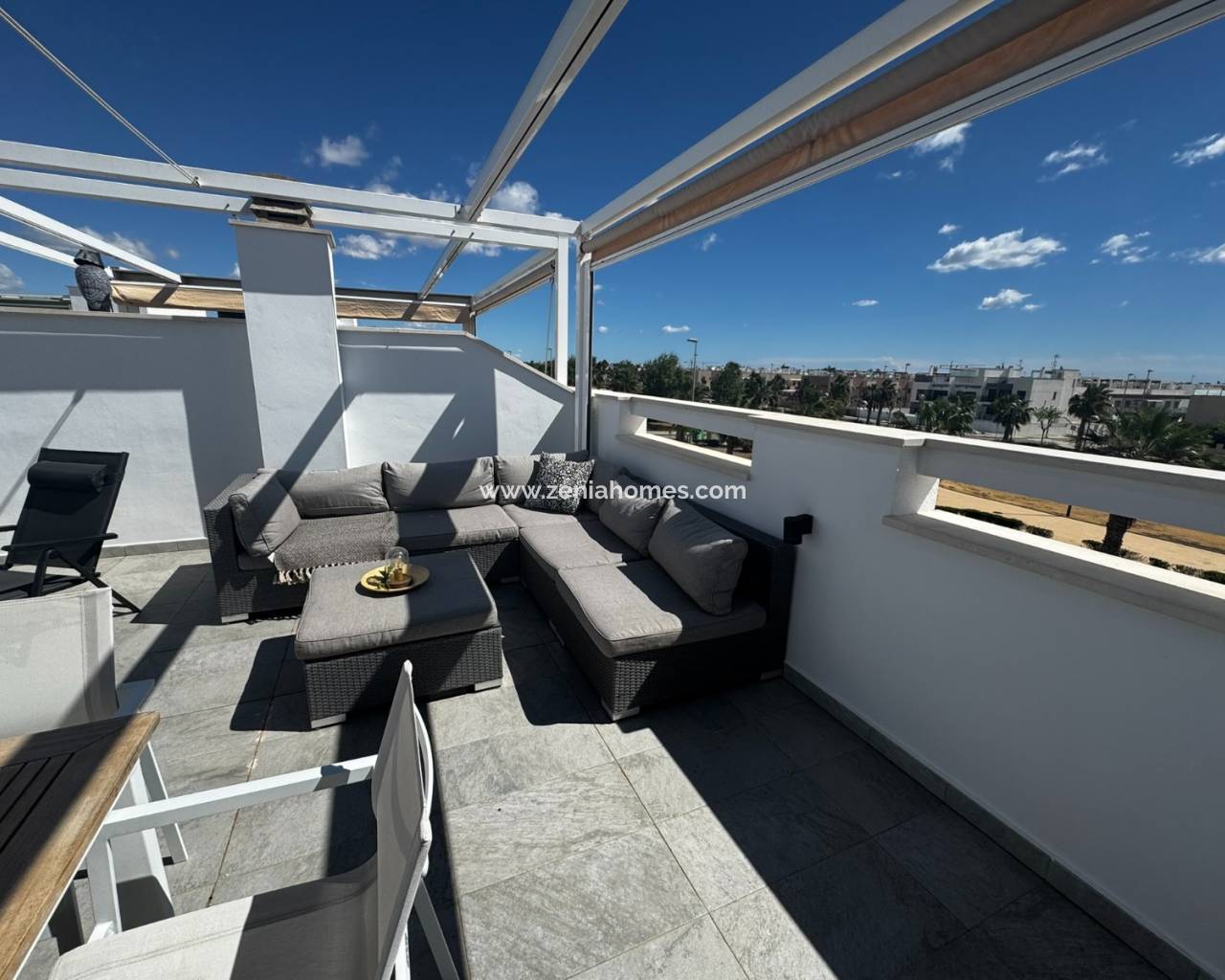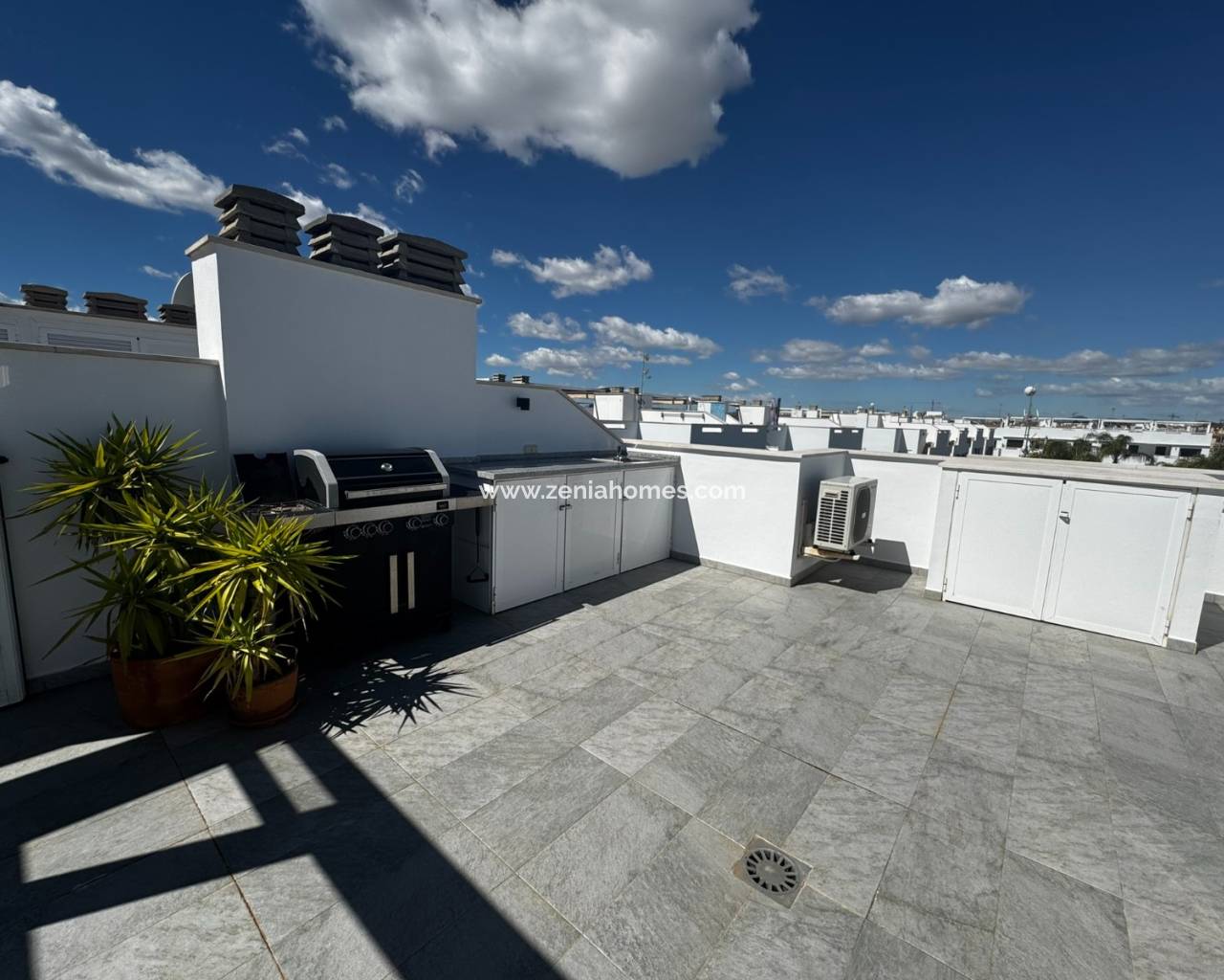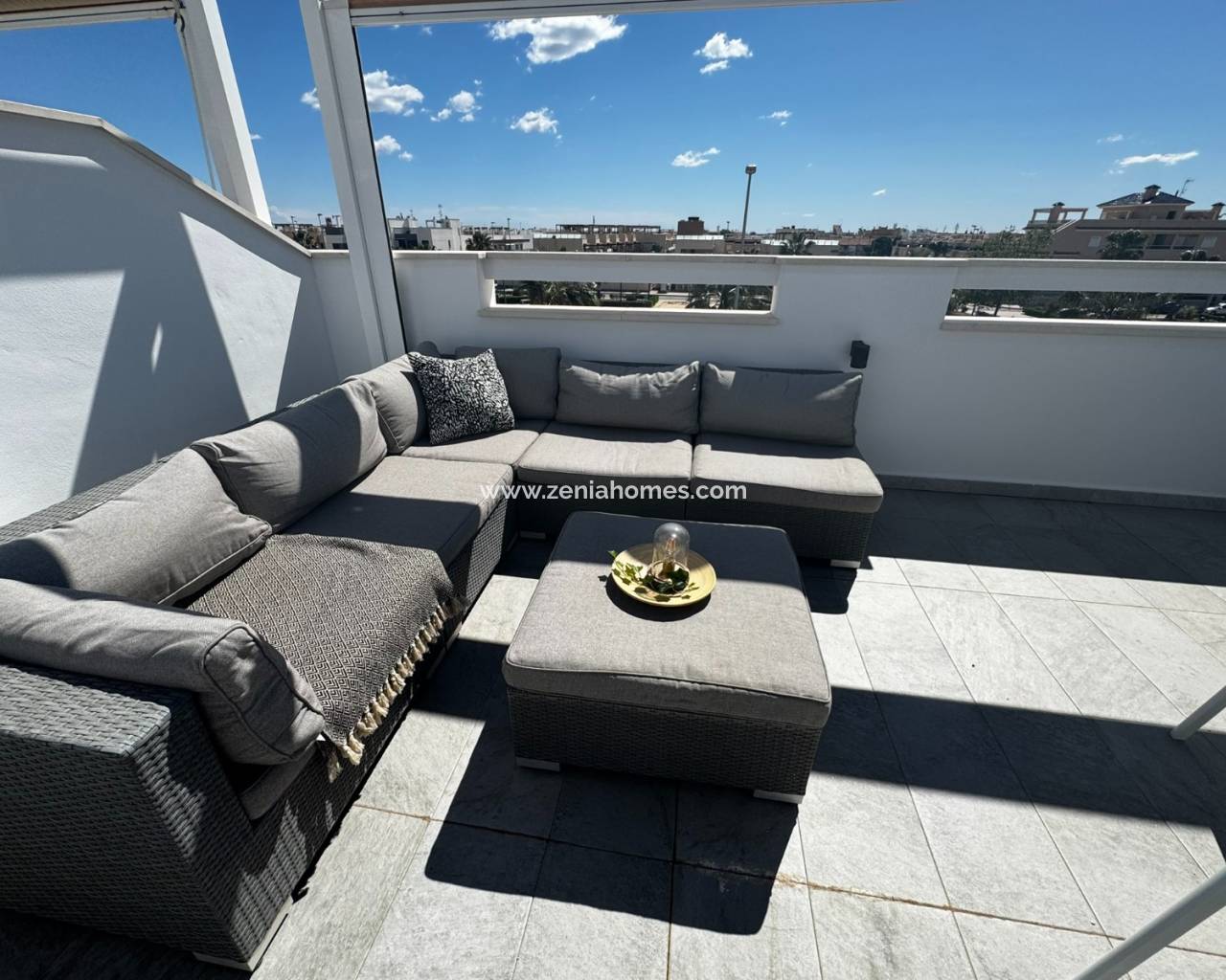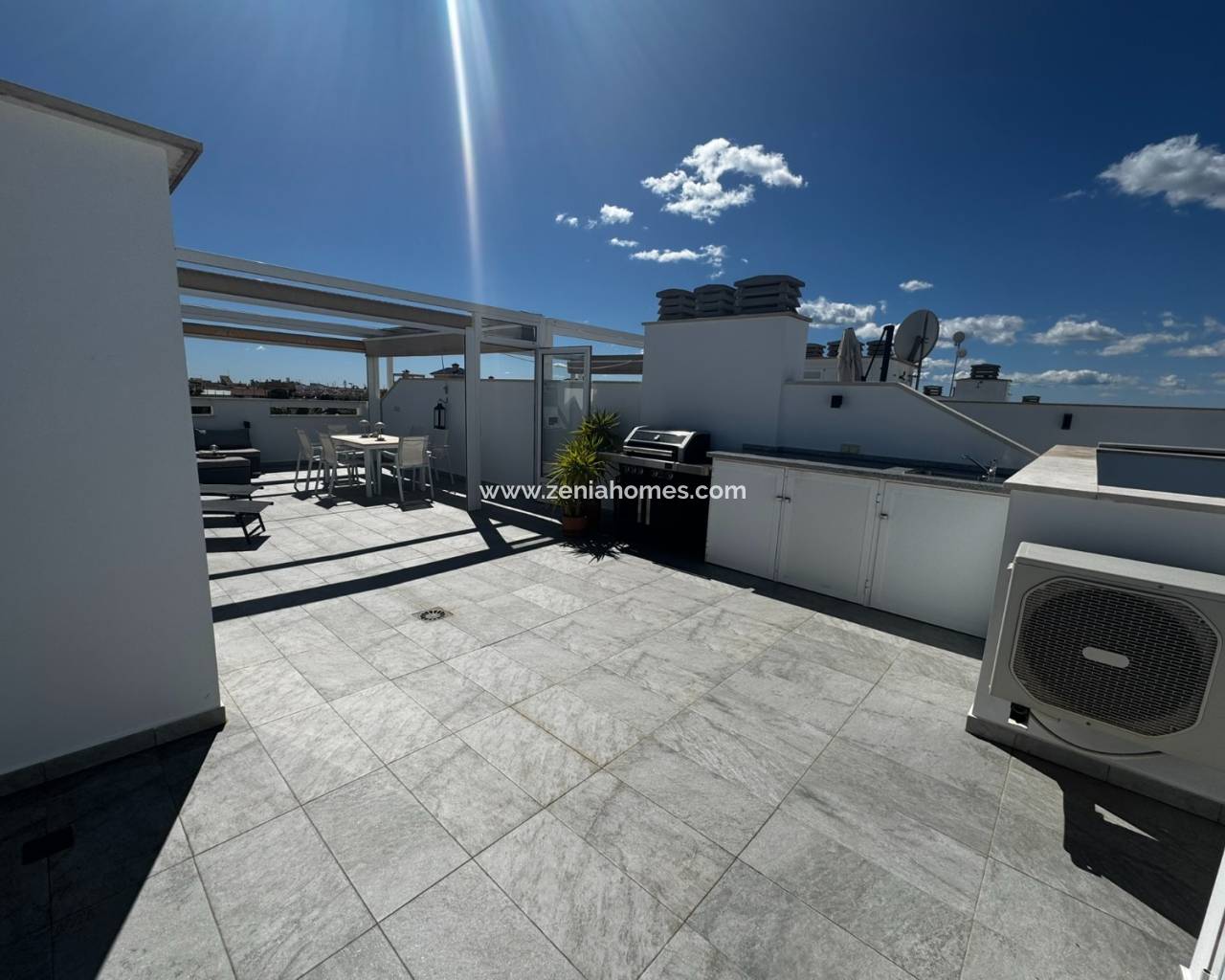 En perfekt underhållen takvåning med vacker inredning och finish. Denna fastighet har 2 sovrum och 2 badrum, båda med golvvärme och varm/kall luftkonditionering. Utmärkt läge med utsikt över parken och havet från den rymliga soliga terrassen, där ägarna har installerat ett pentry, förråd och en stor hopfällbar pergola för komfort i alla väderförhållanden. Samhället har en vacker gemensam pool, en för vuxna och en för barn, och en trevlig jacuzzi.