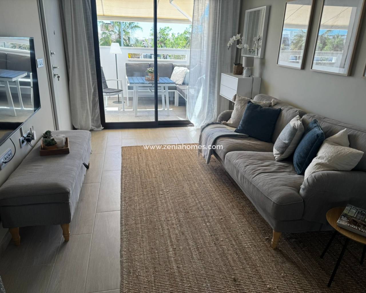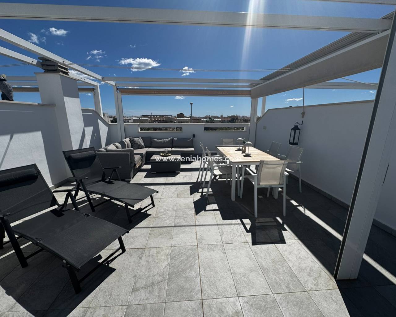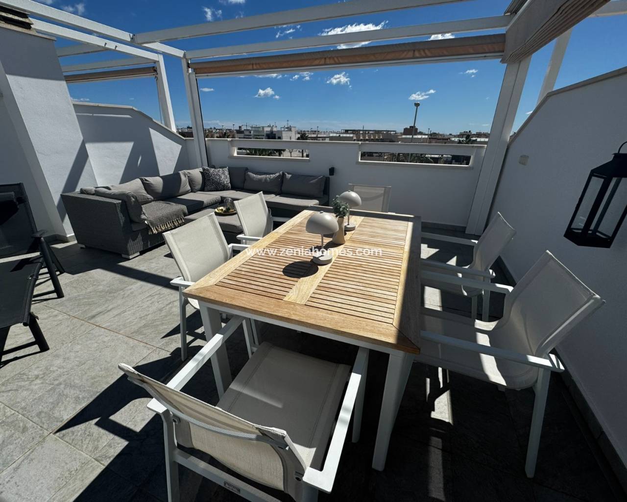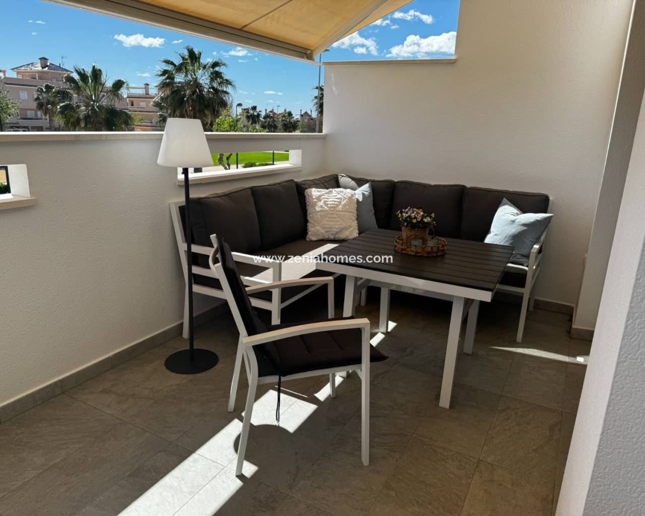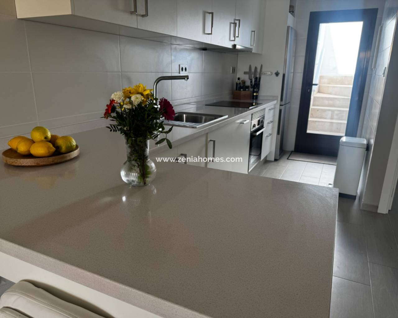 En perfekt underhållen takvåning med vacker inredning och finish. Denna fastighet har 2 sovrum och 2 badrum, båda med golvvärme och varm/kall luftkonditionering. Utmärkt läge med utsikt över parken och havet från den rymliga soliga terrassen, där ägarna har installerat ett pentry, förråd och en stor hopfällbar pergola för komfort i alla väderförhållanden. Samhället har en vacker gemensam pool, en för vuxna och en för barn, och en trevlig jacuzzi.