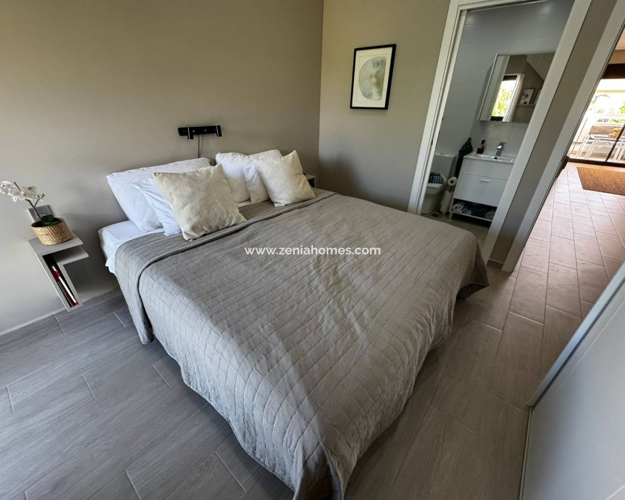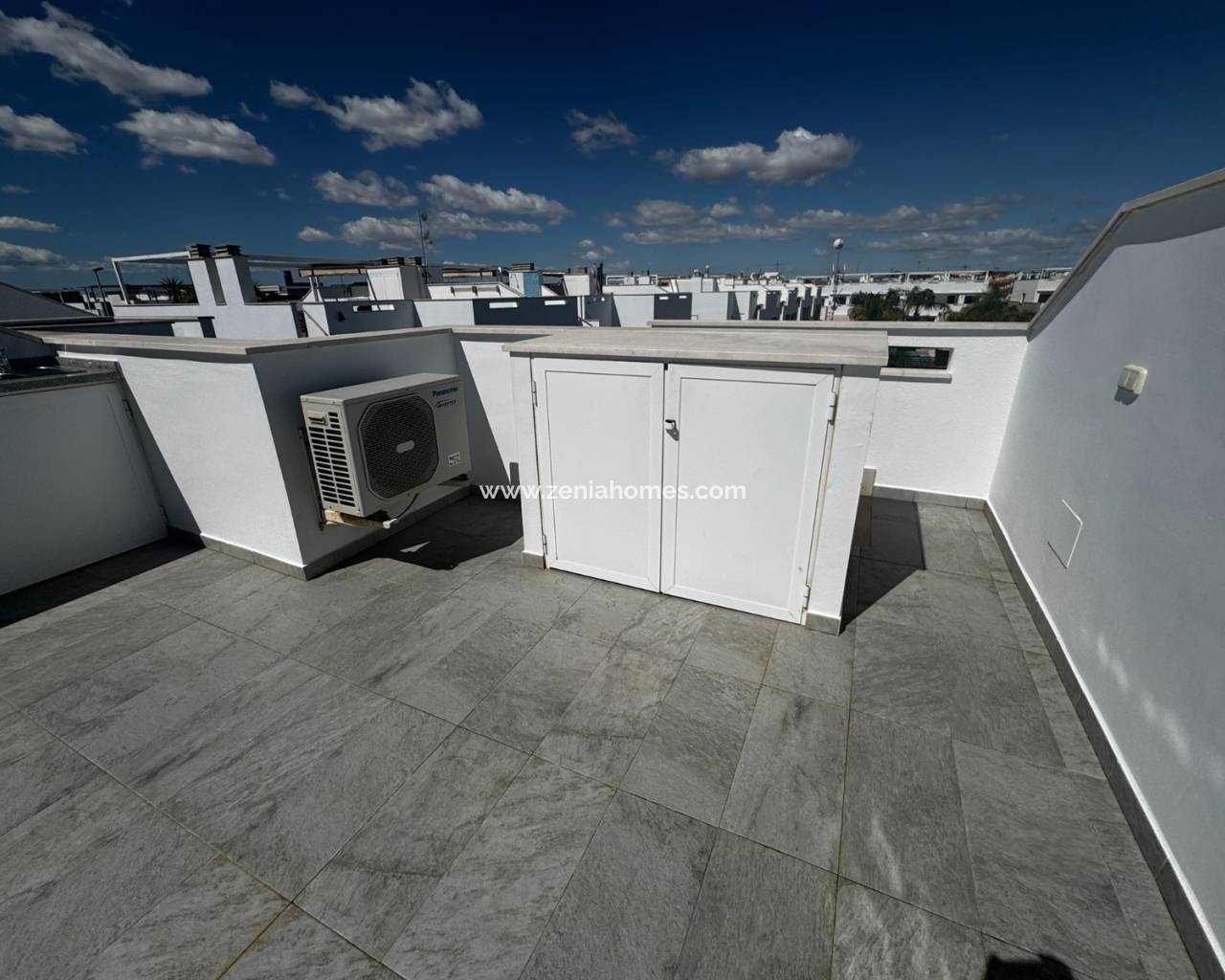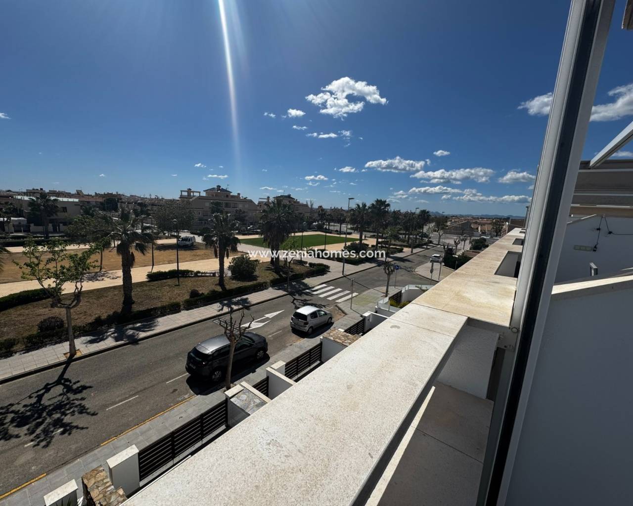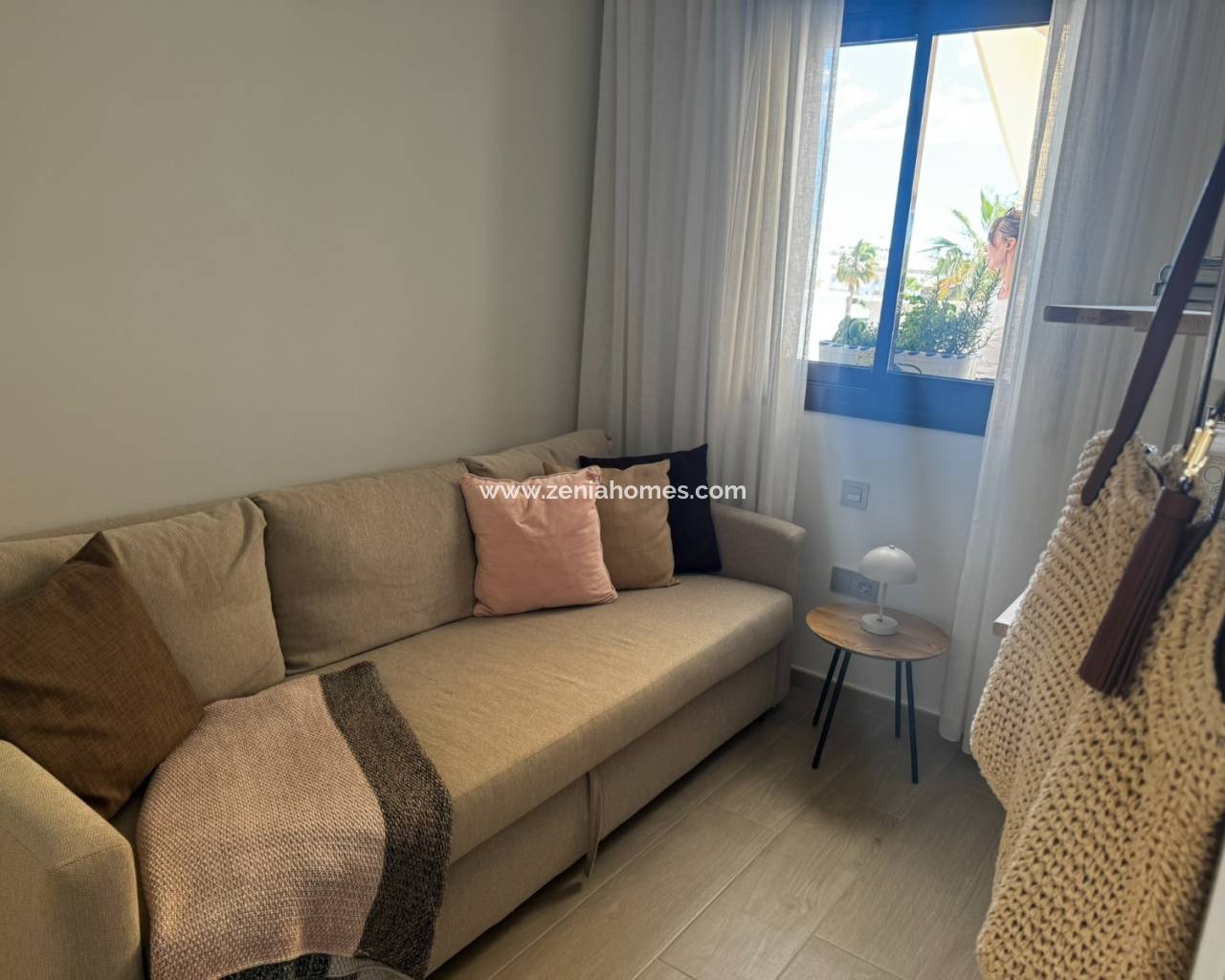 En perfekt underhållen takvåning med vacker inredning och finish. Denna fastighet har 2 sovrum och 2 badrum, båda med golvvärme och varm/kall luftkonditionering. Utmärkt läge med utsikt över parken och havet från den rymliga soliga terrassen, där ägarna har installerat ett pentry, förråd och en stor hopfällbar pergola för komfort i alla väderförhållanden. Samhället har en vacker gemensam pool, en för vuxna och en för barn, och en trevlig jacuzzi.
