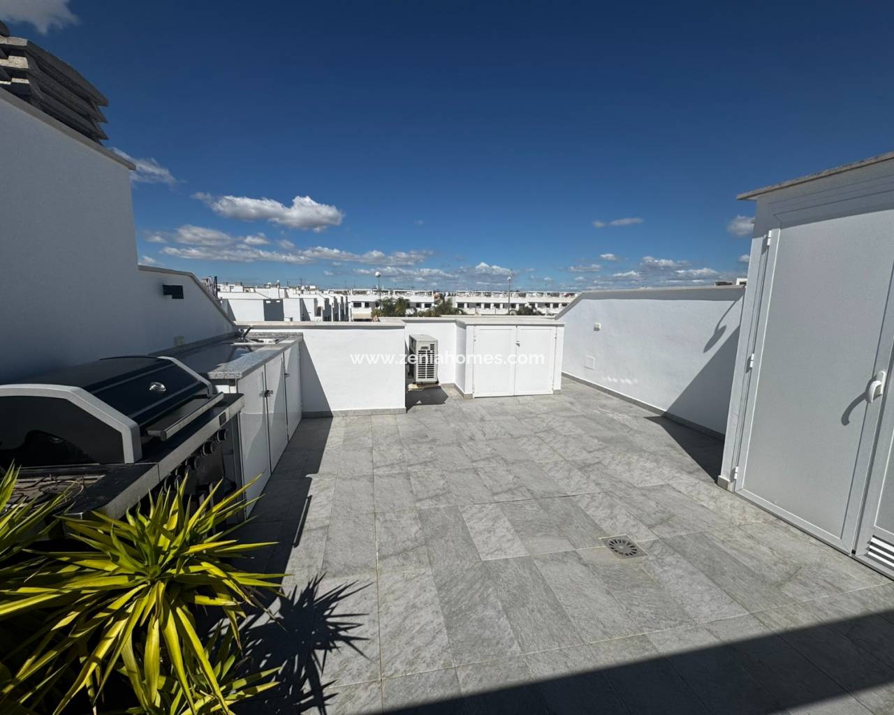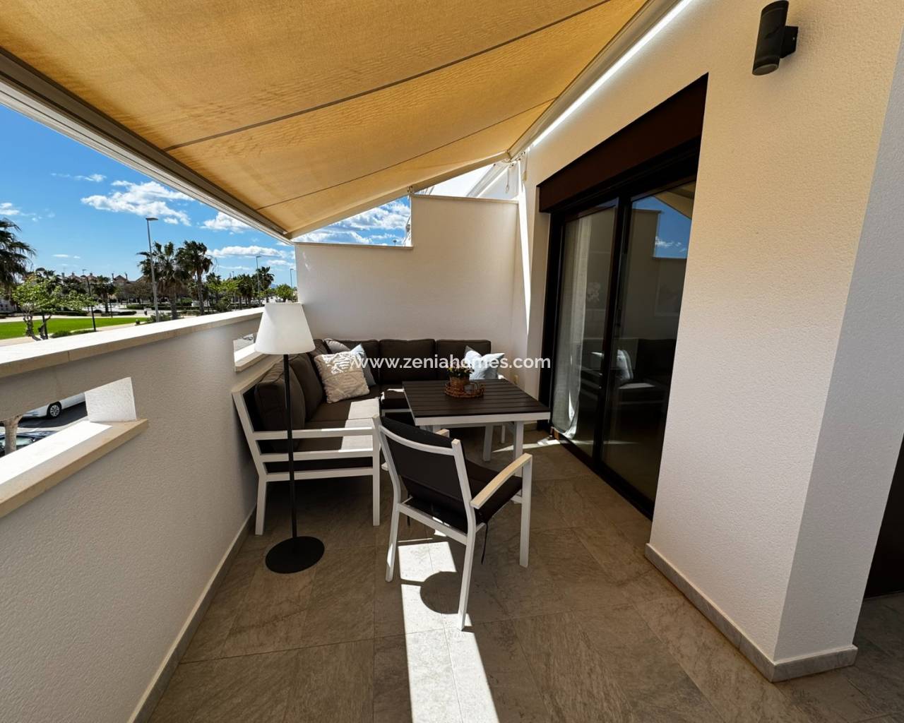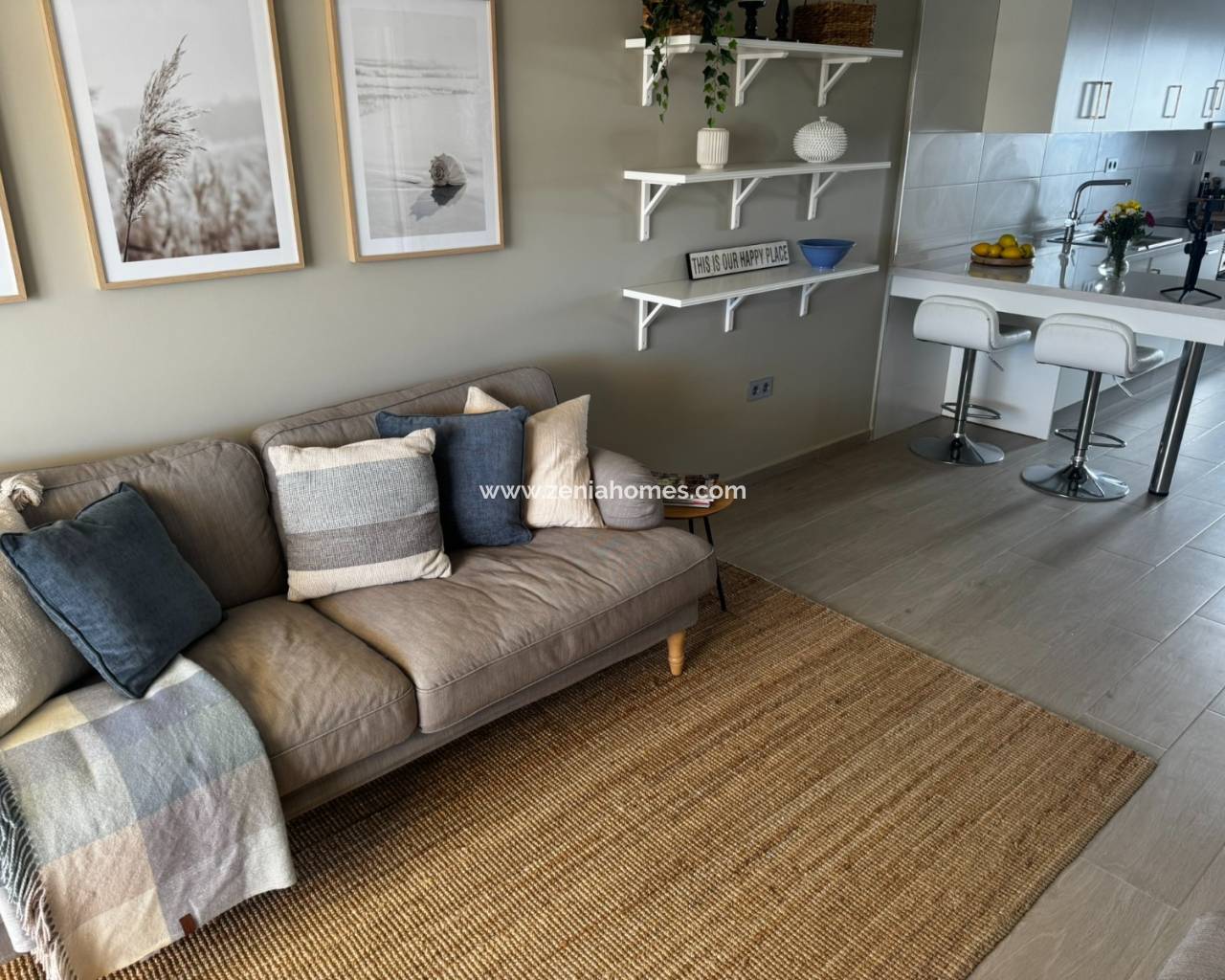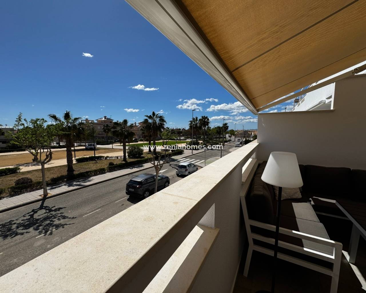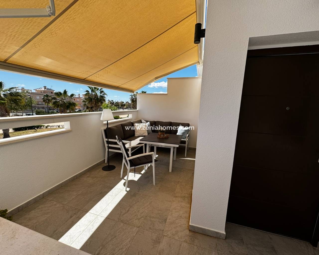 En perfekt underhållen takvåning med vacker inredning och finish. Denna fastighet har 2 sovrum och 2 badrum, båda med golvvärme och varm/kall luftkonditionering. Utmärkt läge med utsikt över parken och havet från den rymliga soliga terrassen, där ägarna har installerat ett pentry, förråd och en stor hopfällbar pergola för komfort i alla väderförhållanden. Samhället har en vacker gemensam pool, en för vuxna och en för barn, och en trevlig jacuzzi.