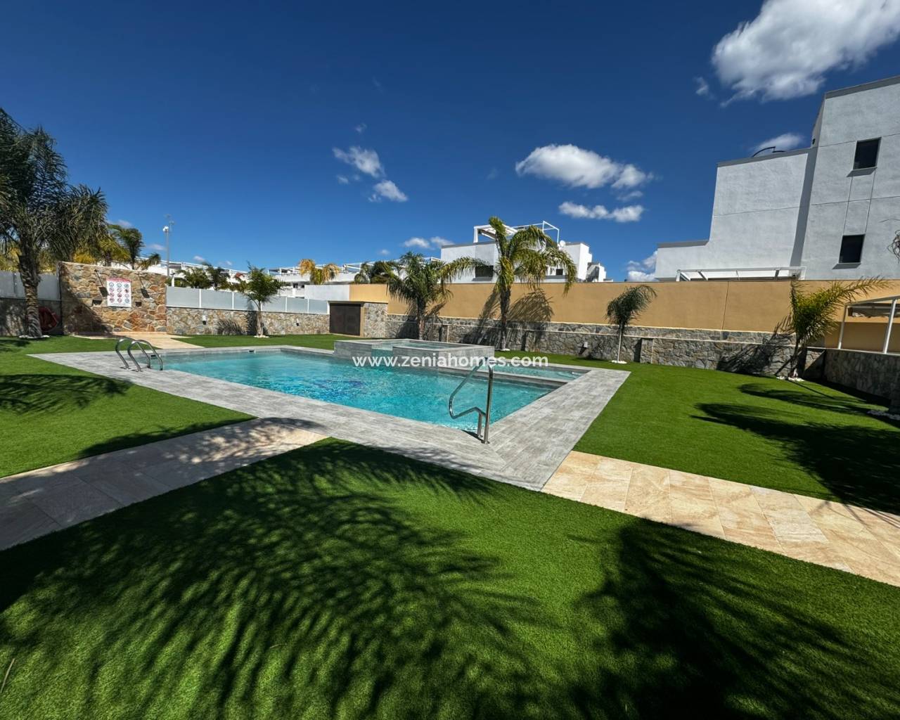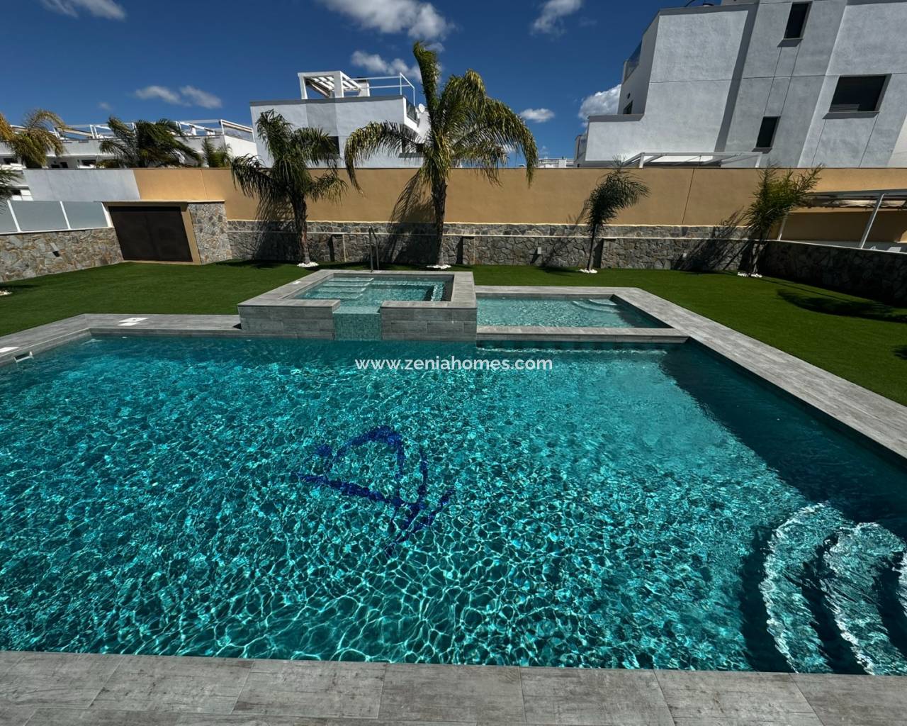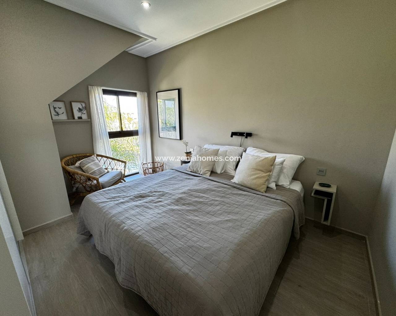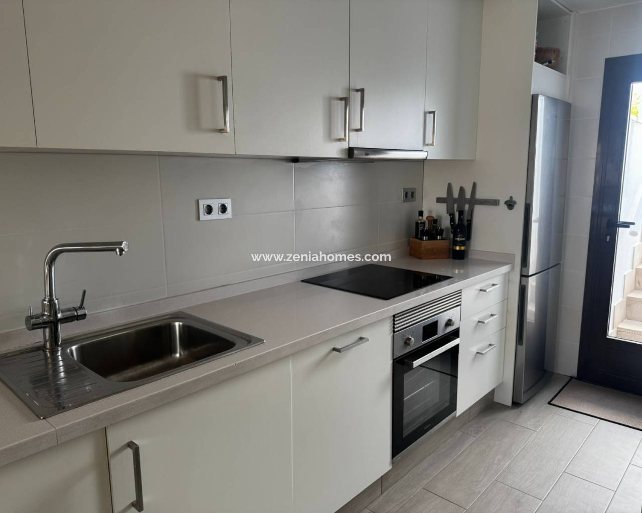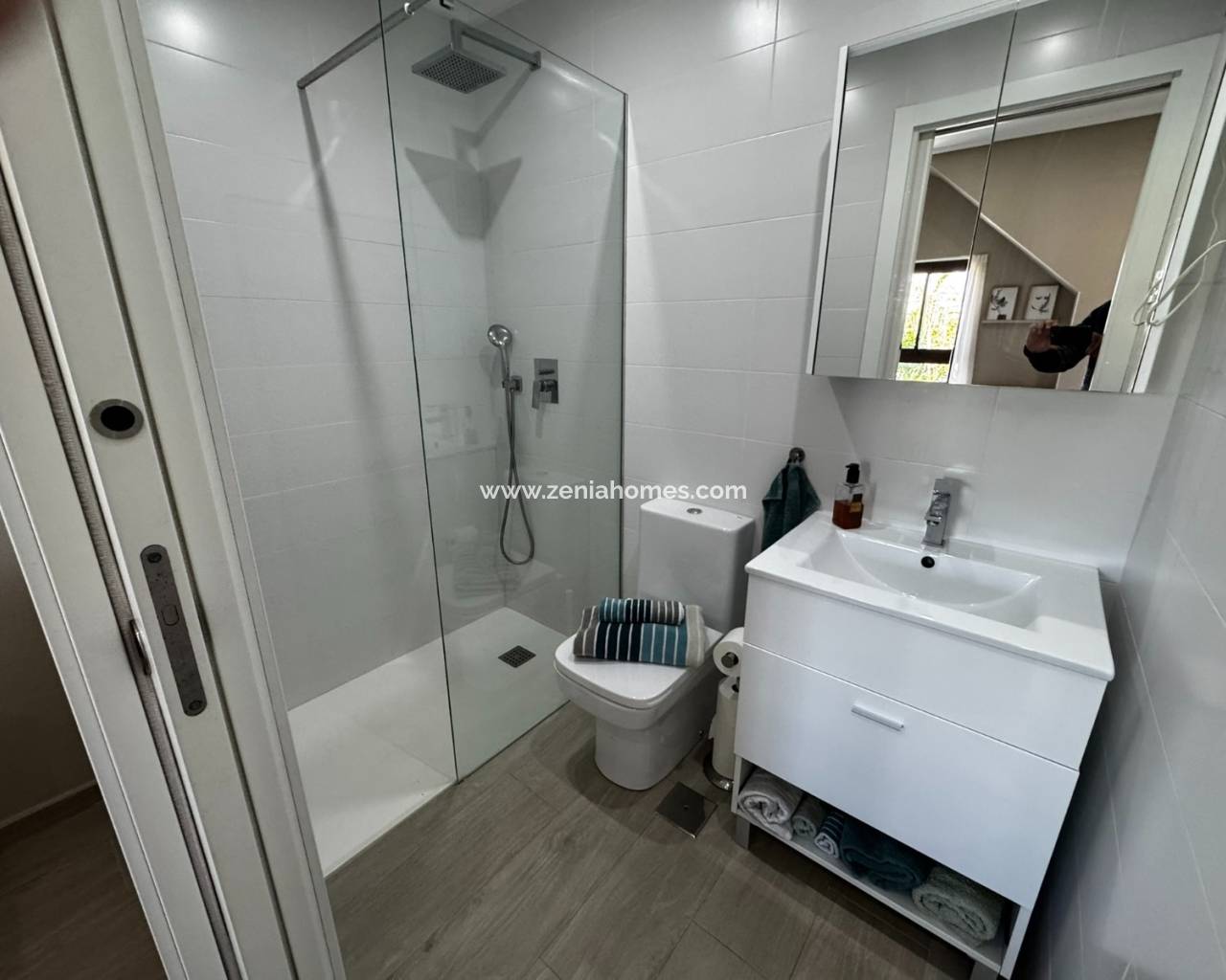 En perfekt underhållen takvåning med vacker inredning och finish. Denna fastighet har 2 sovrum och 2 badrum, båda med golvvärme och varm/kall luftkonditionering. Utmärkt läge med utsikt över parken och havet från den rymliga soliga terrassen, där ägarna har installerat ett pentry, förråd och en stor hopfällbar pergola för komfort i alla väderförhållanden. Samhället har en vacker gemensam pool, en för vuxna och en för barn, och en trevlig jacuzzi.